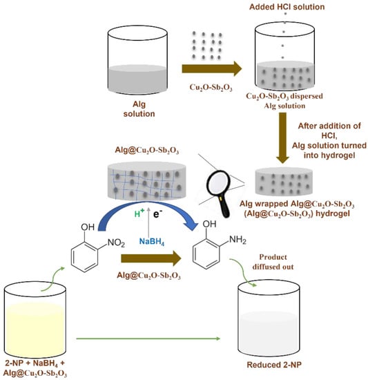 Scheme of Alg@Cu2O-Sb2O3 preparation and catalytic reduction of 2-NP.