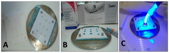 (A–C): Pictorial description of specimen’s fabrication. (A) Mold filled with base material in first sheet. (B) Phosphoric acid gel applied on base material. (C) Composite filled in second sheet of Teflon sheet, added on top of the first sheet and material cured with LED light.