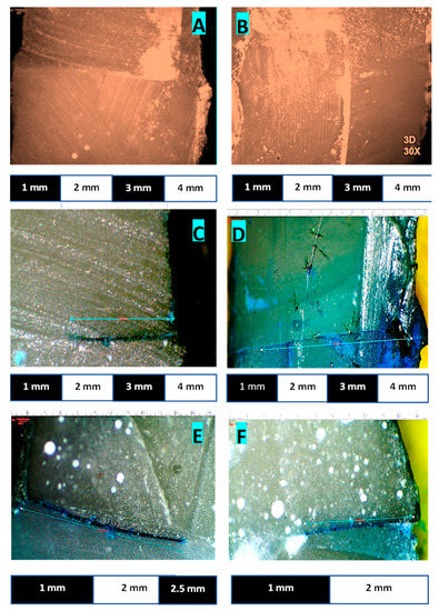 (A–F): (A) Stereomicroscope image taken at 25× stereomicroscope from Group 3A Control level; (B) Stereo image taken at 30× stereomicroscope from Group 3B Control level; (C) Stereo Image taken at 45× stereomicroscope from Group 2A 500 cycles/30 s; (D) Stereo image taken at 45× stereomicroscope from Group 2A 1000 cycles/30 s; (E) Stereo image taken at 45× stereomicroscope from Group 4A 500 cycles/30 s; (F) Stereo image taken at 45× stereomicroscope from Group 4A 1000 cycles/30 s.