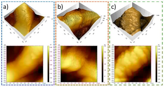 Atomic Force Microscopy (AFM) is a type of microscopy that employs a cantilever probe to physically touch the surfaces, when operated in contact mode. The Coulomb forces exerted on the cantilever by the surface of the sample can then be characterized by piezoelectric components or laser-detector setups. This allows for topographical measurements with resolutions of under 1 nm []. When in contact mode, however, the stiffness of the cantilever is superior to that of the bonds present in many polymers. One advantage of AFM is that it allows for the characterization of not only morphological, but of mechanical and even physical–chemical properties. Figure 4 shows a typical AFM micrograph of an electrospun scaffold fiber. In it, 3D renderings of the fiber surface are shown.
