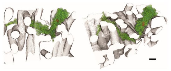 Confocal laser scanning microscopy (CLSM) is a technique that allows for spatial filtering and increased resolution of light microscopy through the suppression of light not transmitted directly from the focused part of the sample. It can be combined with fluorescence microscopy and is therefore another powerful tool to image cell growth. Due to the ability of CLSM of obtaining 2D images at different depths, a 3D image can be reconstructed []. The resolution of CLSM is about 10 nm on the XY-plane and about 800 nm on the Z-axis. It can penetrate samples up to 0.3 mm []. Figure 6 depicts typical 3D CLSM micrographs.