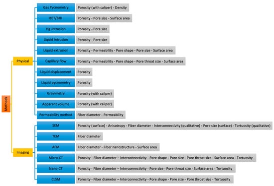 Although reviews exist [,,,] reporting some methods to measure morphological characteristics, they either do not focus on electrospun scaffolds or do not provide sufficient insight into the relevance of individual characteristics, in addition to most of them not including some of the newer characterization methods available. Furthermore, they do not provide strategical alternatives to somewhat inaccessible methods such as nano-CT.