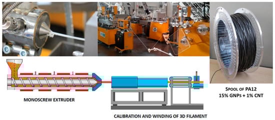 3D printing filament manufacturing was performed at 230 °C using a single-screw extruder with a water-cooling bath combined with a filament shaper to calibrate a diameter of 1.75 mm and 4 km long. The extrusion process and the produced spool of PA12_15%GNPs + 1%CNTs can be seen in Figure 1. The filament was evaluated by TGA and DSC, and the technical detail is listed in Table 1.