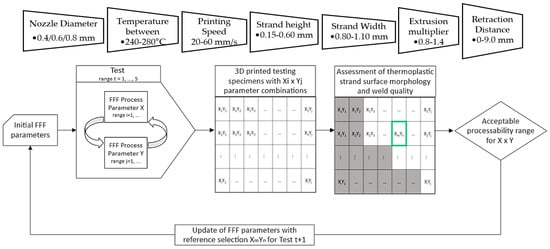 For FFF processability assessment, filament segments of 30 cm were cut and measured with a digital caliper to determine the average diameter of each segment. Filament drying was conducted by a hot-air drying oven at 80 °C for 12 h, and all segments were conditioned prior to testing in a low-humidity enclosure. The Raise 3D Pro 2 Plus FFF system was employed for the fabrication of testing specimens with different process parameters, and the generation of custom Gcode scripts was conducted through 3DOptimizer software (FabControl SIA). Firstly, a preliminary extrudability assessment was conducted for three nozzle diameters (0.4, 0.6, 0.8 mm) in order to assess flow consistency and extrusion temperature range. After the nozzle diameter (0.8 mm) was selected, seven different temperatures above the melting temperature (189 °C in Table 1) were tested, from 240 °C to 280 °C, for printing quality examination. Subsequently, sequential interdependence tests were conducted by varying nozzle temperature, printing speed, extrusion multiplier (volumetric flow rate compensation factor), retraction, and thermoplastic strand width and height as seen in Figure 2. Precise leveling and calibration of the FFF system and first layer settings were conducted prior to each test. Stereomicroscope evaluation (S9 stereomicroscope, Leica Microsystems) was conducted to assess morphology and deposition consistency of thermoplastic strands, aiming to identify parameter sets that eliminated structural defects related to over/under-extrusion and presented high strand uniformity.