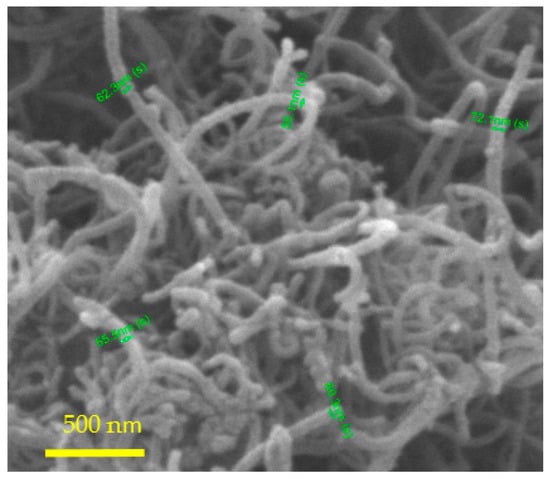 Multiwalled carbon nanotubes (MWCNTs) were prepared with the supported catalyst approach and had an average diameter of 50–80 nm, as shown in Figure 3. They were in an entangled form, with embedded catalyst at their end caps, implying a tip growth mechanism.
