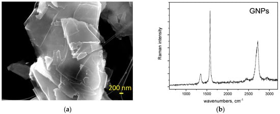 The GNPs powders were dispersed on adhesive conductive tape for SEM characterization. The platelets had a lateral dimension within the range of 2–10 μm, with thickness of a few tens of nanometers. The material was partially exfoliated (or reaggregated), with platelets showing highly exfoliated regions together with thicker crystals (Figure 4a). The GNPs Raman spectra present very sharp and high-intensity G (1580 cm−1) and 2D (2680 cm−1) lines, which corresponds to high-crystallinity and low-defects surface structure (Figure 4b). The most prominent “disorder” Raman spectrum, D-line (1360 cm−1), suggests an increase in the amount of crystallite boundaries with decreasing crystal size or to the presence of graphite edge planes perturbing the smoothly stratified crystallites.