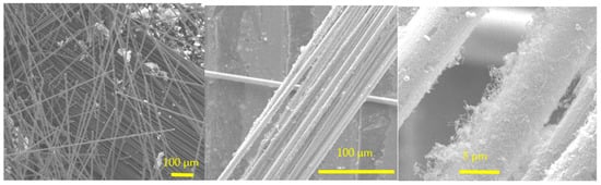 The CNT-based materials, either in powder form or grafted on CFs, were synthesized through the chemical vapor deposition (CVD) method. For the first case, the well-established supported catalyst method was utilized, with Fe/zeolite catalyst and acetylene as carbon source []. On the contrary, in order to achieve a good grafting of CNTs onto the CFs, different approaches were investigated. Following the supported catalyst approach, the fibers (5–6 mm long) were impregnated in the catalyst solution (Fe particles embedded on zeolite, the same as the conventional procedure for CNT synthesis in powder form) and then left to dry. The coated fibers were spread on an inert substrate and inserted into the CVD reactor. Conventional experimental conditions were set (T = 700 °C, flow rate of acetylene: 60 mL/min, flow rate of Ar: ~200 mL/min). According to the floating catalyst approach, both the ferrocene catalyst and the ethanol precursor were introduced simultaneously into the CVD system, similar to the configuration in []. For each batch, 20 g of chopped CFs was introduced into the center of the metallic tube of the CVD reactor. The furnace was heated up to 600 °C in atmospheric air to remove the polymeric sizing on the CFs and to induce mild oxidation. Then, Ar was introduced into the system, which was sealed for 20 min to enable purging. The temperature was raised to 750 °C [], then the mixture of ethanol and ferrocene (1 g C10H10Fe diluted in 100 mL C2H5OH) was boiled, and the vapor was transferred with the carrier gas (flow rate of Ar: ~300 mL/min) in the reactor. The reaction lasted for 2 h.