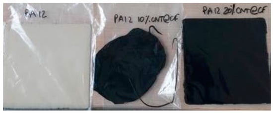 The fabricated coupons of PA12 and PA12 with 10% and 20% inclusions of CNTs@chopped CFs.