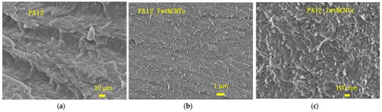 A layered structure can be seen on the fractography of the PA12_15%GNPs+1wt%CNT sample (Figure 8). The composite has a dense structure, and the CNTs are well embedded in the composite (Figure 8c).