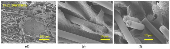 SEM fractography of (a) the neat PA12, (b,c) PA12 with 7 wt% CNTs, and (d–f) the PA12 with 20 wt% CNTs@CFs.