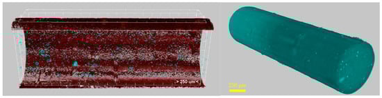 The macro-scale observations regarding the surface quality of the filament are also confirmed through the micro-CT analysis (Figure 9 and Table 2). The shape of the filament appears to be circular and is within acceptable limits, as most areas are quite dense but some macrocracks can be seen in the pellet. Some defects and irregularities on the surface can be attributed to possible agglomerates that form during the manufacturing of the filament.