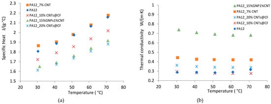 Thermal conductivity of PA12 incorporated with different reinforcements: (a) specific heat and (b) calculated thermal conductivity.