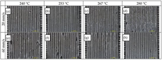 Optical inspection via stereomicroscope (7×) of specimens obtained from varying extrusion temperatures (ET) and printing speeds (PS): (a–d) SP = 20 mm/s and ET = 240, 253, 267, 280 °C from left to right; (e–h) SP = 60 mm/s and ET = 240, 253, 267, 280 °C from left to right.