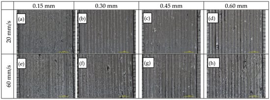 For the selected extrusion temperature, the effect of strand height was assessed for the same range of printing speeds by combining seven strand height values with four printing speed values investigated in the previous step, in a total of 27 variants. As the strand height value (equal to layer height) is employed for the automatic calculation of the filament feed rate, a variation of this value can lead to over- or under-extrusion when the nominal volumetric flow rate is not in accordance with the actual volumetric flow rate required to achieve the targeted strand volume. As shown in Figure 13a–h, for the two upper and lower limit values of printing speed, the effect of nominal strand height increase is demonstrated through a transition from increased overlapping of adjacent strands and rough surface morphology associated with over-extrusion to gap formation due to the associated deviation between nominal/actual volumetric flow rate. Acceptable limits for strand height and printing speed were defined as 0.30–0.45 mm and 20–47 mm/s, respectively. Furthermore, seven strand widths were studied at a printing speed of 33 mm/s and strand height of 0.3 mm, and it was found that the acceptable limits for strand width were between 1.00 and 1.10 mm.