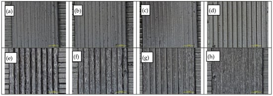 Optical inspection via stereomicroscope (7×) of specimens obtained from varying strand heights (SH) and printing speeds (PS): (a–d) SP = 20 mm/s and SH = 0.15, 0.30, 0.45, 0.60 mm from left to right; (e–h) SP = 60 mm/s and SH = 0.15, 0.30, 0.45, 0.60 mm from left to right.