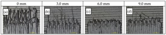 Optical inspection via stereomicroscope (7×) of specimens obtained from varying retraction distances (RD): (a–d) RD = 0.0, 3.0, 6.0, 9.0 mm from left to right.
