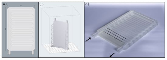 (a) The CAD model of the cooling plate created with Rhinoceros 6 CAD software. (b) The .stl model uploaded in the slicer software. (c) The manufactured cooling plate using a 3D printer. The arrows indicate the inflow and outflow pipes of the plate, and the dotted lines represent the parallel cooling pipes.