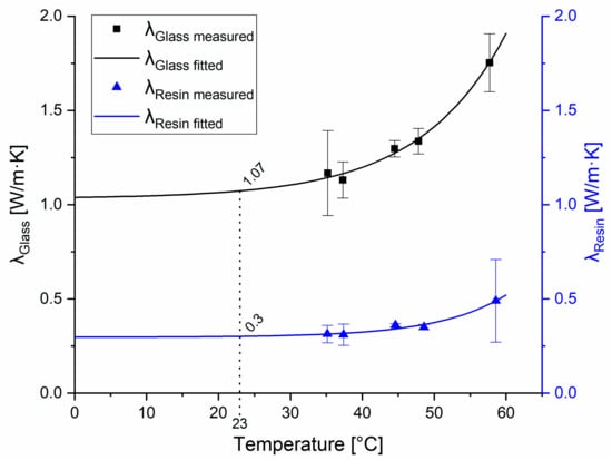 Measured and fitted heat conduction parameters of the tested materials. Heat conduction of the reference glass material is represented by the black curve; the squares show the average values with standard deviations measured at the indicated temperatures. Heat conduction parameters of the resin material are represented by the blue curve; triangles show the measured average values with standard deviations measured at the indicated temperatures.