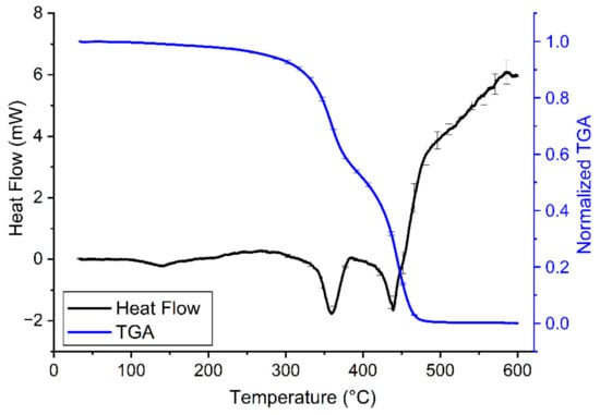 Heating curves of clear resin V4 (30–600 °C, black line) combined with TGA of the samples (30–600 °C, blue line) on a common temperature scale (i.e., abscissa) at a heating rate of 10 °C/min. On the heating curves, the endothermic process (i.e., when the sample melts) causes a drop in heat flow. A decrease in normalized TGA indicates loss of sample mass. The error bars show the standard error of means from at least 3 independent measurements.