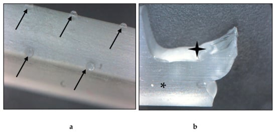 Images of the fabricated resin material taken with a digital microscope. (a) Intact test specimen, surface on the edge. The black arrows point to the protrusions, which are the remains of the raft. (b) Broken test specimen. The black star indicates the broken, the asterisk marks the intact surface, where the glassy-like structure can be observed. Magnification: 35×.