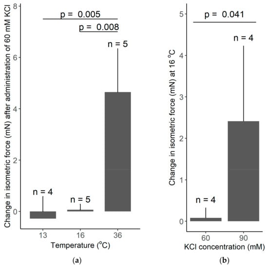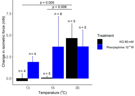 In our thermophysiology experiments, the recorded increase in the isometric force in response to 60 mM KCl was 4.65 mN at 36 °C, whereas it was practically absent at 13 and 16 °C (Figure 7a). Welch ANOVA showed a significant effect of temperature on the KCl-induced vasomotor response (p = 0.002). With Games–Howell post hoc test, we found a significant difference in the KCl-induced change in isometric force between 13 and 36 °C (p = 0.005), as well as, between 16 and 36 °C (p = 0.008), while there was no significant difference between 13 and 16 °C. However, when the concentration of KCl was increased from 60 to 90 mM, we found a significant (p = 0.041) increase in the isometric force of the tail artery at 16 °C (Figure 7b). The latter finding further supports the capability of the used experimental setup to record vasomotor responses in the cold; furthermore it underlies the existence of temperature-dependent differences in vascular responses.