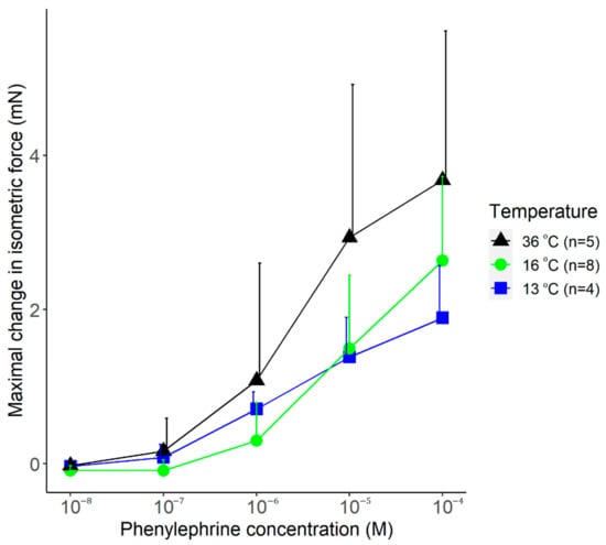 The vasomotor response to increasing doses of phenylephrine was also studied at the different temperatures. Phenylephrine caused an increase in the isometric force of the arteries at all temperatures (viz., 13, 16, and 36 °C) with similar dynamics (Figure 8). The maximal vasomotor response tended to be smaller in the cold (at 13 and 16 °C) than at 36 °C, but the effect of temperature did not reach the level of significance (p = 0.11).