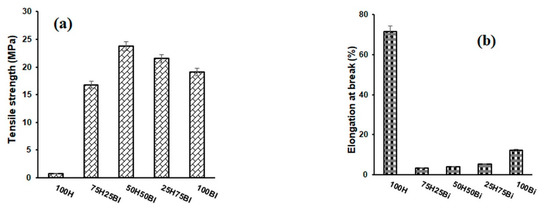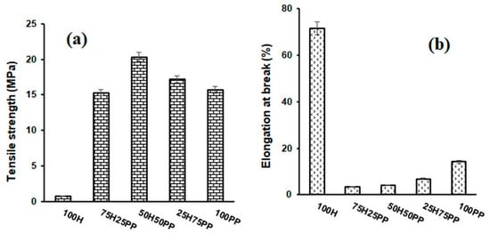 Variation in tensile strength (a) and elongation at break (b) for composite materials of hemp and polyester fibres.