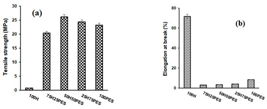 The mechanical properties of the fibres used as reinforcing agents, of the polymeric fibres used as matrices, and of the composite materials obtained from them are shown in Figure 1, Figure 2 and Figure 3. The 100% hemp sample, which is a nonwoven material, has a much lower tensile strength (0.76 MPa) than composite materials. The tensile strengths of composite materials containing hemp fibre as a reinforcer increased as the content of the polymer matrix increased. The highest values were obtained for the composites that contain a quantity of hemp ranging between 30 and 50% (w/w), after which there was a slight decreasing tendency of the tensile strength. Regarding the nature of the matrix, the highest values of tensile strength were obtained for composite materials with polyester matrix (26.2 MPa), followed by composite materials with bicomponent fibre (23.77 MPa) and then by composite materials with polypropylene (20.33 MPa).
