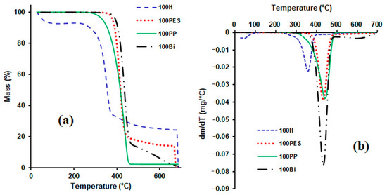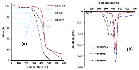 Regarding the influence of the matrix on the thermal stability of the composite, it can be observed that the composite material with the polyester fibre matrix exhibited the highest thermal stability, being followed by the composite with a bicomponent fibre matrix. For the same mass losses, the decomposition temperatures of the composites decreased in the order of 50H50PES > 50H50BI > 50H50PP.