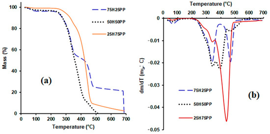 After analysing the TG curves of composite materials containing hemp as the reinforcing agent and polypropylene as the matrix (Figure 5), it can be observed that: in the first stage of degradation (between 25 and 150 °C), the mass loss increased with the increase in the hemp content, as would be expected, since the polypropylene matrix has a strong hydrophobic character and does not absorb moisture.