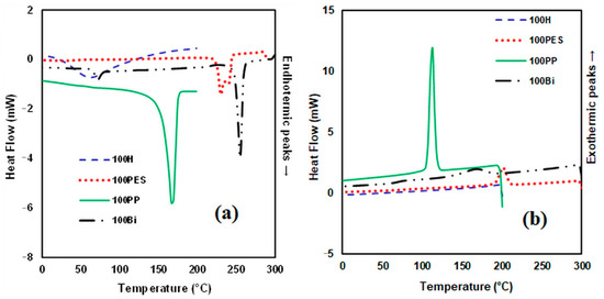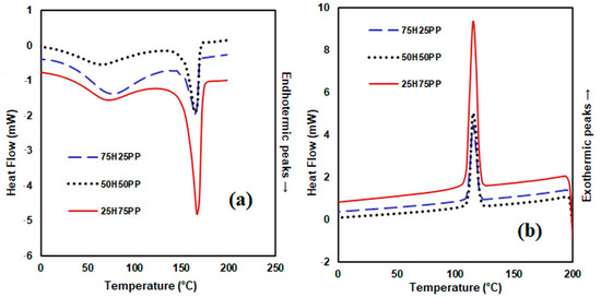 Regarding the influence of hemp fibre content (Figure 9a) in polypropylene fibre matrix composites, the DSC curves are consistent with the TGA curves. The first endothermic peak appears at 70 °C for composite 25H75PP, at 72 °C for composite 50H50PP and at 75 °C for composite 75H 25PP, respectively.