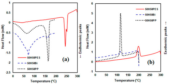 Regarding the nature of the matrix derived from the analysed composites (Figure 8), from the DSC curves, it can be observed that the first peak appears at 62 °C for the composite 50H50BI, at 72 °C for the composite 50H50PP and at 78 °C for the composite 50H50PES. These peaks are assigned to the endothermic processes that correspond to the evaporation of moisture from the composite material. The second peak occurs at 159 °C for 50H50BI, at 166 °C for PP and 248 °C for polyester fibre, respectively. From the diagrams resulting from the cooling process, the exothermic crystallisation peaks appear at 115 °C for 50H50PP, at 113 °C for 50H50BI and at 197 °C for 50H50PES, respectively. The composite materials obtained from 25H75 PP and 50H50PP have a higher melting temperature compared to the melting temperature of PP, while composites obtained from 75H25 PP have a lower melting temperature compared to the melting temperature of PP fibres. This could be explained by an increased interaction between the PP matrix and the reinforcer for composites containing up to 50% H. These results are also correlated with the results obtained in the case of physical–mechanical indices when the tensile strength increases up to a composition of about 50% hemp fibres, after which it shows a decreasing tendency.