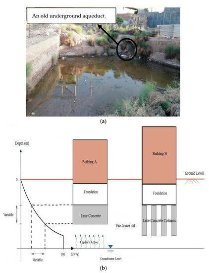 Water penetration into lime-based concrete; (a) a dug land exposed to the rise in groundwater level and aqueducts in Kerman city; and (b) The effect of the capillary phenomenon on two buildings constructed over LCC and LCC columns [23].