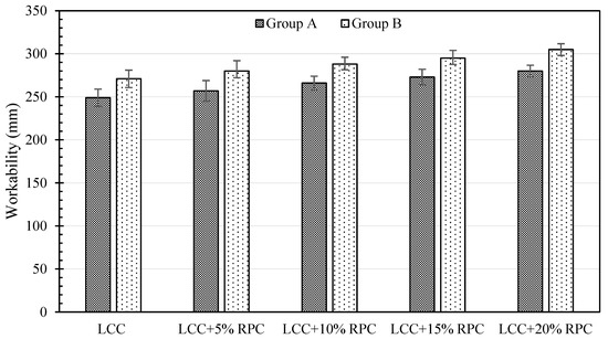 From the results of flow table tests presented in Figure 3, it can be observed that the workability of concrete Group A of the samples is lower than that of Group B. The higher workability of Group B samples compared to Group A can be attributed to the fact that the specific gravity of the lime is lower than that of cement, and the surface area of cement is lower than that of lime. Moreover, as observed in Figure 3, the workability of the samples decreases with the increase in RPC, which could be attributed to the hydrophobic characteristics of rubber powder and their substitution with natural aggregates with hydrophilic nature. In other words, the amount of free water was slightly increased in the matrix, which improved the workability. However, from the workability test results, it could be concluded that the workability of all the samples was relatively high enabling the concretes to be placed in the molds without the need for vibration or compaction, which is suitable for practical applications.