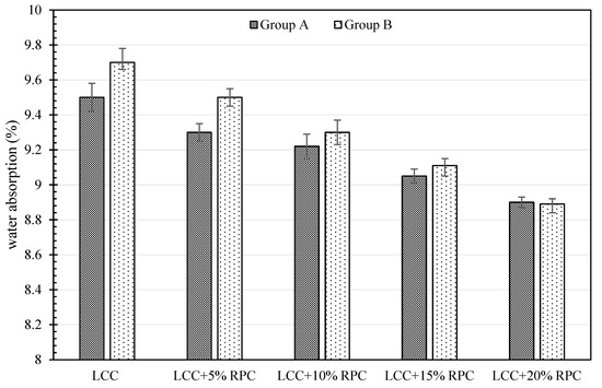 The water absorption rate is often considered a good indication of the durability of concrete and cementitious materials. As observed in Figure 4, Group A and Group B samples had approximately identical water absorption rates. More precisely, water absorption rates of Group A samples were slightly lower compared with Group B. This could be attributed to the higher content of lime in these samples. In other words, the lower specific gravity of lime compared with cement results in the incorporation of the higher volume of lime in the samples. This eventually leads to minor pores in comparison with Group B of the samples, which brings about lower water absorption. In addition, a reduction in water absorption in both groups could be vividly observed, with the increase in RPC. This is also due to the hydrophobic characteristics of rubber powder and their replacement with natural aggregates with hydrophilic characteristics. Moreover, the difference between the water absorption rates of Groups A and B samples decreases with increasing RPC such that in the samples containing 20% rubber powder the water absorption of Groups A and B are approximately equal. This may be because with the increase in RPC some existing pores in Group B samples (due to lower lime content in Group B compared with Group A) become filled, which decreases the difference between the water absorption rates of Groups A and B samples.