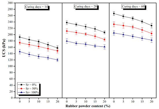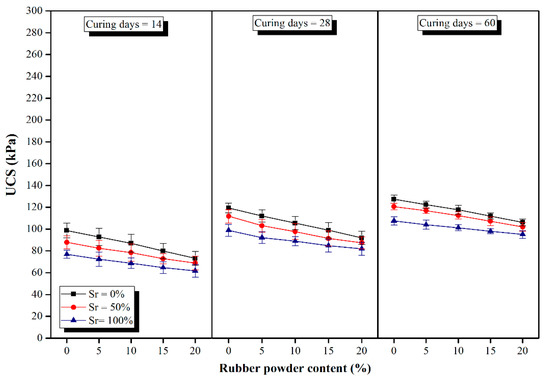 As shown in Figure 5 and Figure 6, the UCS values at different curing times and various rubber contents decreased by increasing the degree of saturation which could be attributed to the partial disintegration of the chemical bonds between lime and clayey soil. Although strength reduction due to the saturation increment was higher for samples in Group B compared with Group A, the ultimate UCS values of Group B samples, even in the condition of full saturation, were greatly higher than those obtained for samples of Group A, implying their superb resistance in the presence of moisture. To illustrate, by increasing the Sr from 0 to 50%, 8.50% reduction in strength (from 177.87 to 162.75 kPa) was observed for the 14-day cured samples of Group B with 10% RPC; also, further increasing the Sr from 50 to 100%, brought about a linear decrease of 19.42% in the compressive strength of samples (from 162.75 to 131.13 kPa). While in the case of Group A samples, the reductions were respectively 9.76% (from 86.96 to 78.44 kPa) and 12.42% (from 78.44 to 68.69 kPa). As observed, although strength reduction due to the increase in saturation degree is comparatively higher for samples of Group B, their ultimate strength after full saturation is more than twice those from Group A. Moreover, the strength reduction due to the RPC increment is lower at higher degrees of saturation implying the superb resistance of rubber powder in the presence of moisture. For instance, at 0% Sr, the 14-day cured samples of Group A experienced a strength reduction of 25.84% by increasing the RPC from 0 to 20%, while at 100% Sr the reduction was 16.69%. Similar trends were obtained for the other specimens.