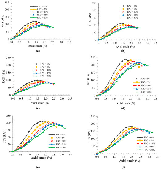 The compressive strength of specimens increased with increasing the curing period due to the hydration reactions. Nevertheless, insignificant increases in strength values were obtained after a curing period of 28 days, which was in line with the findings of previous studies [23,24]. In other words, all of the samples gained more than 80% of their 60-day strength at a curing period of 28 days, for instance, the 28-day cured sample of Group B with 10% RPC at 50% Sr had a strength value of 201.86 kPa, which was 90% of its 60-day UCS value.