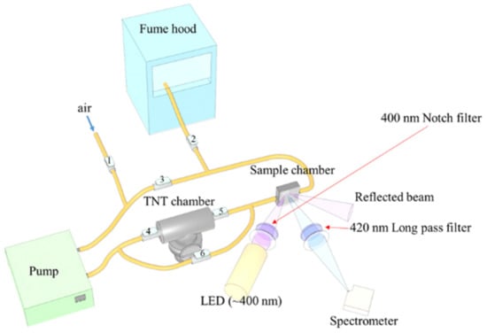 A custom-built unit was used as shown in Figure 1. The set-up was made up of a TNT chamber, a sample chamber covered by a transparent sapphire window, a pump, Teflon, and silicon tubes, as well as valves that were manually opened and closed during measurements. The flow rate of the pump was controlled with a computer. During PL quenching measurements, valves 1, 2 and 6 were closed while the rest were opened to allow the flow of TNT vapor in a closed cycle. To maintain a relatively constant vapor pressure, a closed cycle was used. After the PL quenching measurement, valves 3, 4 and 5 were closed, and all the other valves were opened so that the air could be pumped into the sample chamber and residual TNT molecules could flow into a fume hood. A FLAME-S-VIS-NIR-ES (FLAME miniature spectrometer, Ocean Insight®, Orlando, FL, USA) was employed to measure the PL spectra. The polymer films were illuminated with an LED (~400 nm) operating in a pulse mode. Pulse mode was used to decrease the effects of optical degradation, which may be caused by the CW mode and highpower LED excitations. All the optics as well as the sample chamber were completely covered with a dark curtain to block out any external light during measurements.