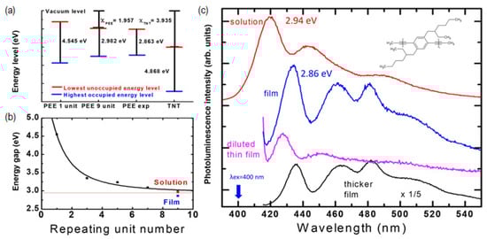 (a) The HOMO and LUMO energy levels of PEE and TNT. Calculations were done with the Orca ab-initio calculation package with the DFT-B3LYP/6-31G level of theory. (b) Energy gap as a function of the number of PEE monomer repeating units. Red and blue dots are the experimentally observed PL peak energies in solution and in film, respectively. (c) PL spectra of PEE in toluene solution phase (red), film phase (blue), thin film phase (magenta), and thicker film phase (black). The molecular structure of PEE is shown in the inset.