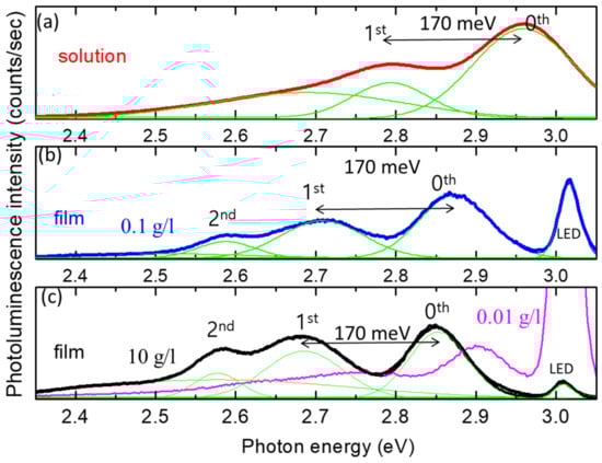 PL spectra of PEE with toluene solvent. The spectra were divided by spectrometer sensitivity. In the spectra, the main PL peak (labeled 0th) corresponds to the bandgap energy and the PL peaks (labeled lst and 2nd) are attributed to the phonon side-band peaks. Green curves show the peak deconvolution results with Gaussian functions. (a) Solution phase of PEE in a concentration of 0.1 g/L. (b) PEE film fabricated with a concentration of 0.1 g/L. (c) PEE films fabricated with concentrations of 10 g/L (black) and 0.01 g/L (magenta).