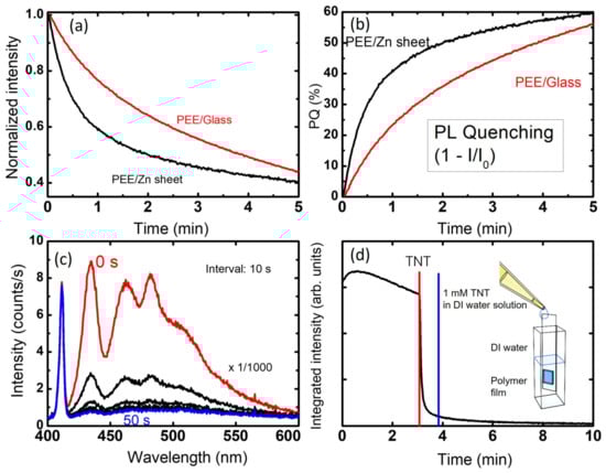 (a) Time-dependent integrated PL intensity of PEE films deposited on glass and on Zn sheet when exposed to TNT vapor at a flow rate of 6 L/min. (b) PL quenching curves of PEE films by TNT vapor as a function of time. (c) The change in the PL spectra observed with a glass/PEE film, which was initially placed in a transparent glass cuvette containing DI water. When 1 mM aqueous TNT solution was added, PL quenching was observed. (d) Time-dependent integrated intensity curve of PEE film deposited on glass and placed in aqueous solution. The arrow in the figure indicates the time when the TNT solution was added. A schematic diagram of the experimental set-up is shown in the inset.