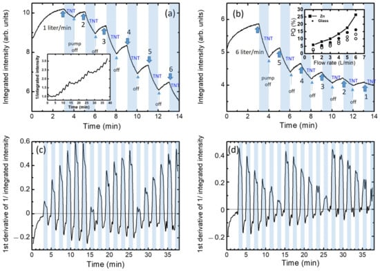 Time-dependent integrated PL intensity with various flow rates observed with glass/PEE films. The flow rate was controlled with a pump, as shown in Figure 1. The pump was turned on and off for a minute for each flow rate. A closed cycle was used while the TNT vapor was already inside of the sample chamber. Blue shaded parts indicate the pump-on period. The flow rates were changed (a) from 1 L/min to 6 L/min and (b) from 6 L/min to 1 L/min. The cycle was repeated 3 times and the inset of (a) shows the reciprocal of the normalized intensity. The inset of (b) shows the PQ (%) as a function of flow rates for the repeated cycles. The PQ from Zn/PEE film is also included. (c,d) represent the first derivatives of the reciprocal normalized integrated intensities of (a,b).