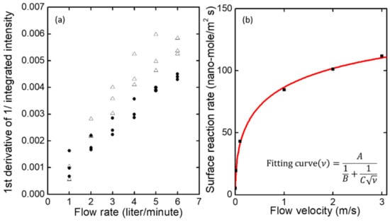 (a) The peak values of the first derivatives of the reciprocal normalized integrated intensities obtained from Figure 5c,d as a function of flow rate. The first derivative represents how rapidly the non-radiative recombination rate increases as TNT molecules are attached on the surface or diffused into the film. The effect of flow rate on the first derivative is clearly observed. (b) Effect of flow velocity on surface reaction rate. The black points are those obtained from CFD simulation. A fitting curve is shown in red. The fitting formula is included.