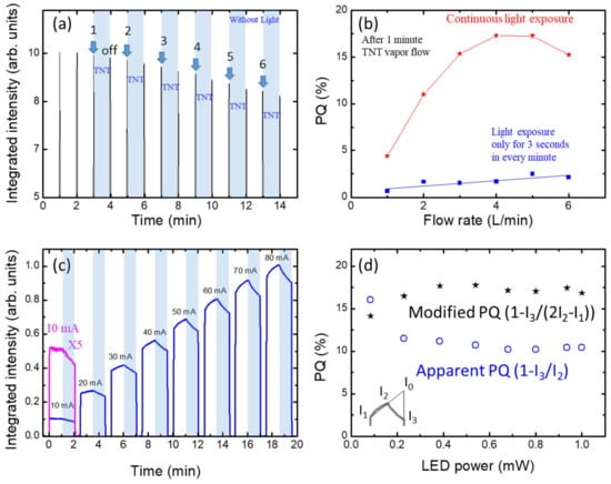 We investigated the excitation power dependence and have shown the results in Figure 7c. As seen in Figure 7d, the PQ values (blue) appeared somewhat decreased when increasing the excitation power up to the LED power of 0.4 mW, above which the PQ was almost independent of the LED power. As in Figure 5a, the air flow was zero for one minute, and then the pump was turned on so that the air flow (containing TNT vapor) was 6 L/min for the next one minute. We note that the PQ values in Figure 7d were obtained without taking into account the increase in PL due to the LED excitation. Considering the increase in PL intensity with the exposure of the light, we used I0 = I2 + (I2 − I1) rather than I0 = I2, where I1 was the recorded PL intensity when the light was turned on and I2 was the PL intensity just before TNT vapor exposure. Here we assumed that the PL intensity would linearly increase during the light exposure. The quenching efficiency was thus calculated using the relation (I0 − I3 = (1 − I3/(2I2 − I1)), where I3 is the PL intensity after quenching. We have included the calculated “modified PQ” values in Figure 7d. Above 0.4 mW, the PQ was found to be almost independent of the LED power.
