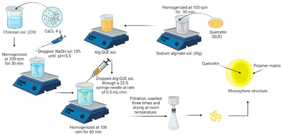 For preparation of microspheres, Na-Alg (0.75% (v/v)) and two Ch (0.1% and 0.2% (v/v)) stock solutions were used. Ch solutions were prepared by dissolution of the required amount of Ch (0.1 or 0.2 g) in 100 mL of freshly prepared acetic acid solution (with a concentration of 2%). After the Ch was added into the acetic acid solution, the system was kept in contact for about 20 min to allow Ch hydration, followed by a mixing process using a magnetic stirrer at 100 rotations per minute for 30 min. Furthermore, in order to obtain proper homogenization of the prepared Ch solutions, recipients were ultrasonicated for 30 min. Finally, 4 g of calcium chloride was added, and the pH was adjusted to 5.5 by adding needed quantity of 10% sodium hydroxide solution. Na-Alg solution was prepared by dispersing 0.75 g Na-Alg in 99.25 g of distilled water, and contact was maintained for a minimum of 30 min in order to allow Na-Alg hydration. Obtained solution was stirred magnetically at 100 rpm for minimum 30 min in order to prevent Na-Alg agglomeration and to improve its dissolution. Furthermore, air bubbles formed during dissolution were eliminated by solution ultrasonication for minimum 20 min. For microsphere preparation, 50 mL Ch stock solution and 20 mL Na-Alg solution were used. The obtained composition of the prepared microspheres is presented in Table 1. For subsequent incorporation of QUE into the prepared microspheres, the required quantity of pure QUE was dissolved into the freshly prepared Na-Alg solution.