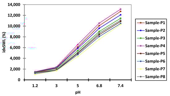 The microsphere swelling index increases in an inversely proportional manner to the increase of the active drug substance concentration, and in an indirectly proportional manner to the increase of Ch concentration in the microsphere composition. In this context, from the data presented in Tables S4–S12 in the Supplementary Materials, it can be seen that the microspheres without drug content (P4 and P8) present the maximum swelling index in all used media, irrespective of pH. Among them, the samples loaded with drug containing 0.1 g of Ch (P1, P2, and P3) present a higher swelling index than those containing 0.2 g of Ch (P5, P6, and P7), as can be seen from data reported in Figure 6 and Figure 7.
