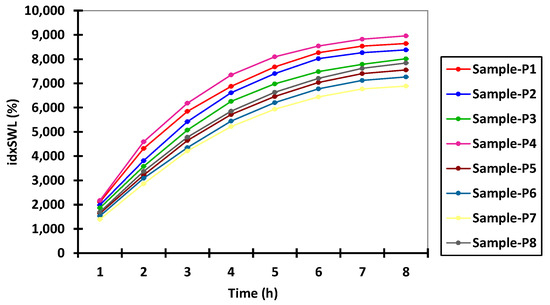 The data obtained for the nonlinear fitting results of the idxSWL (%) time series for samples P1–P8 and all pH factor levels are presented in Tables S15–S22 in the Supplementary Materials. Figure 15 presents graphical comparisons of the results of the nonlinear regression of the idxSWL (%) time series for samples P1–P8 and all pH factor levels.
