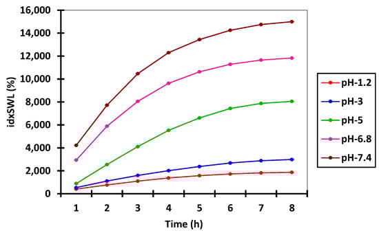 In this context, according to the data presented in Figure 2, any further swelling experiments were carried out over a period of 8 h in both acidic and alkaline pH environments. Tables S2 and S3, in the Supplementary Materials, present the experimental data obtained from the water capture experiment, which was carried out using different time intervals and with different pH values. Figure 3 and Figure 4 present the experimental data obtained from the water capture experiment, which was carried out using different time intervals and with different pH values.