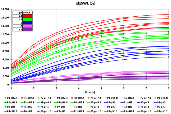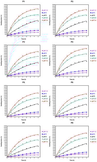 The determination coefficient, R2 (i.e., R square), for all of the samples (P1–P8) and for all pH levels achieved values higher than 0.96 (data depicted in Table S23 in the Supplementary Materials). This fact demonstrates the high accuracy of the analytical measurements, and that the chosen exponential fitting accurately describes the time evolution of the swelling index for all samples and for all pH levels. Additionally, this fact demonstrates the high accuracy of the analytical measurements, and that the chosen exponential fitting accurately describes the time evolution of the quercetin in vitro release for all studied samples.