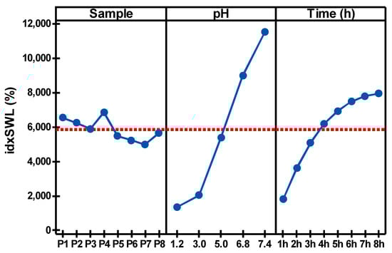 Figure 8 shows a comparison of the factor effects (Sample, pH and Time) on the microspheres’ swelling index (idxSWL (%))based on the three-way ANOVA (p = 0.05). It can be seen that the main effect is due to the pH factor, and mainly occurs for the pH values 6.8 and 7.4. This is followed by the Time factor, which has the second most significant effect on the idxSWL parameter; the idxSWL value at 8 h is almost the same as the value at pH = 6.8 (N.B., these values are overall means over the other factor levels). As a consequence consequence, the authors chose to perform the quercetin in vitro release (mQrel (%)) benchmark only for the samples at pH = 7.4.